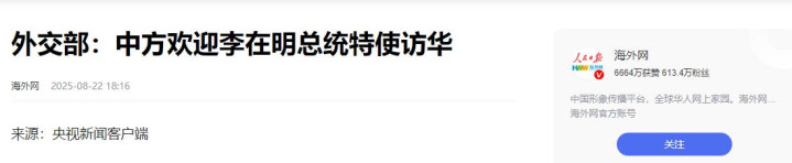 外交部:中方欢迎李在明总统特使访华 2025-08-22 18:16 海外网